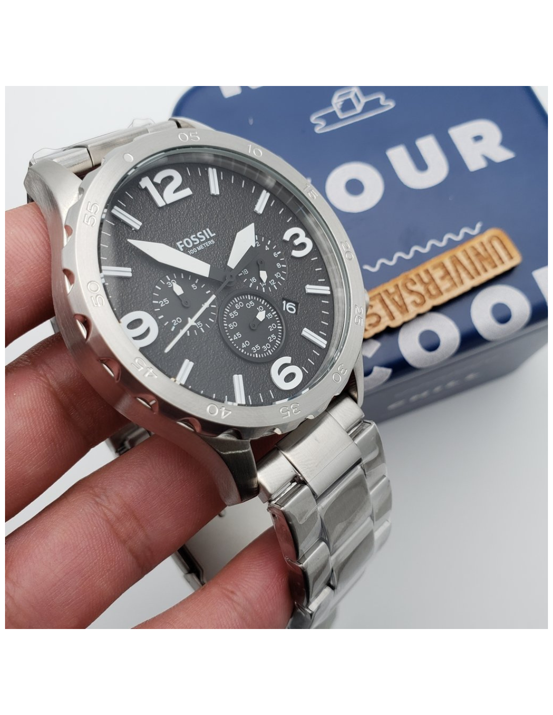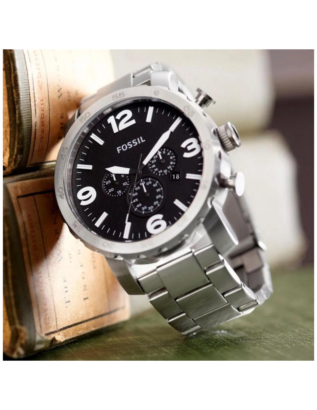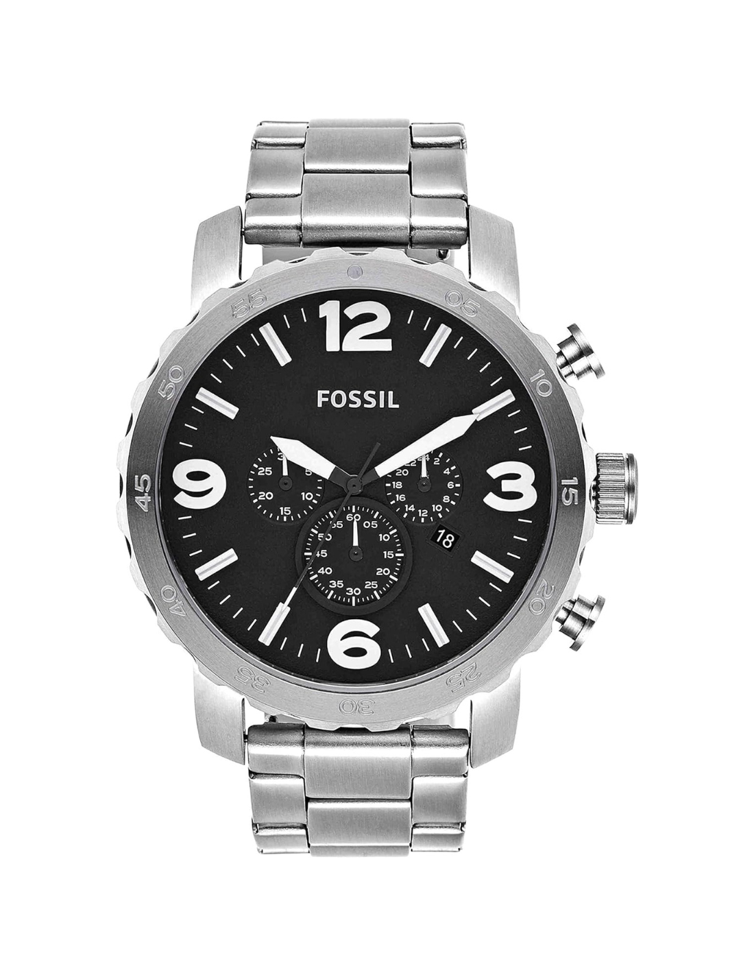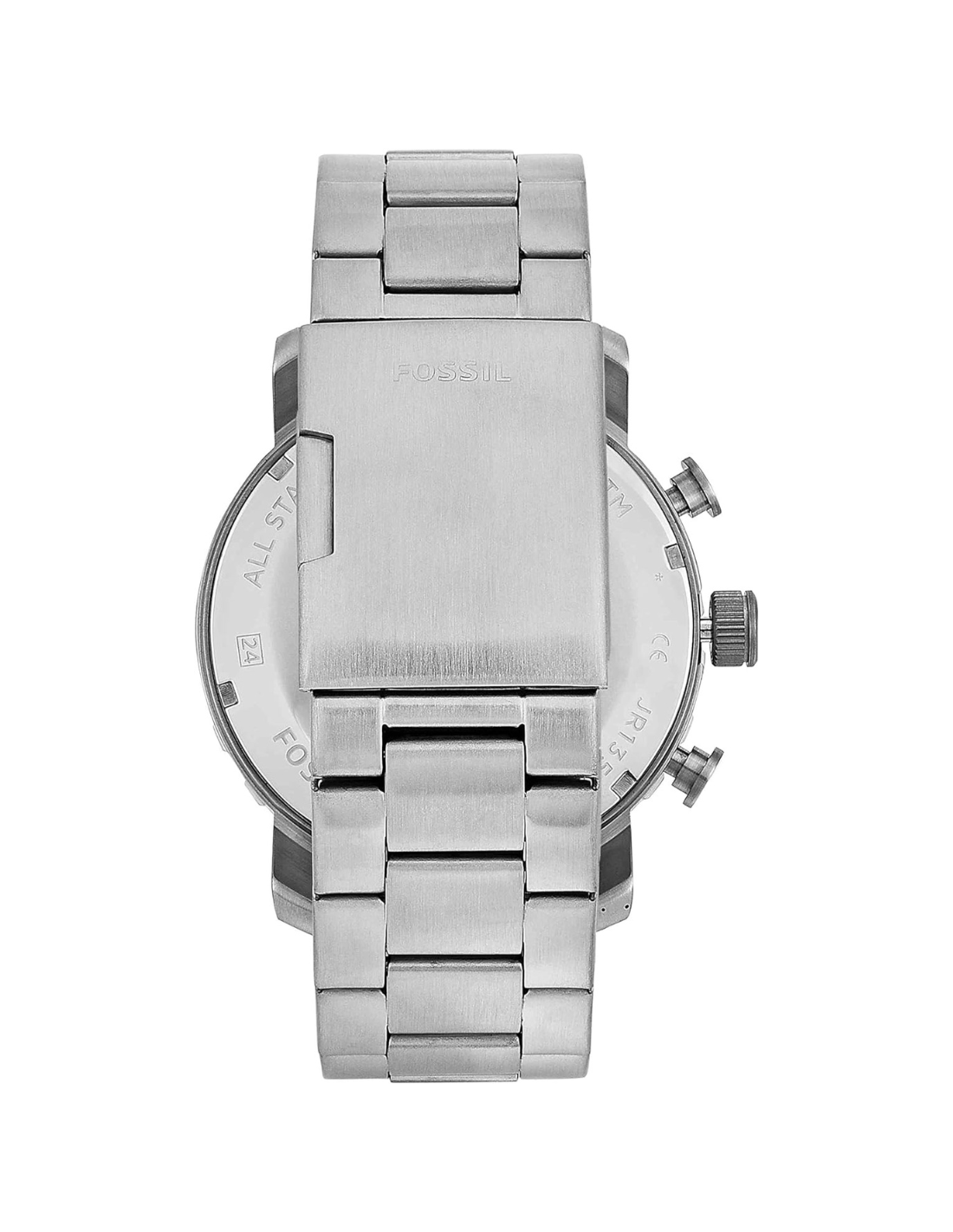- El reloj viene en una caja de acero inoxidable con esfera negra y una correa de acero inoxidable tipo brazalete. Los eslabones se pueden quitar para ajustarla a medida. Además, esta correa es intercambiable con todas las correas Fossil para relojes de 0.94 pulgadas (24 milímetros).
