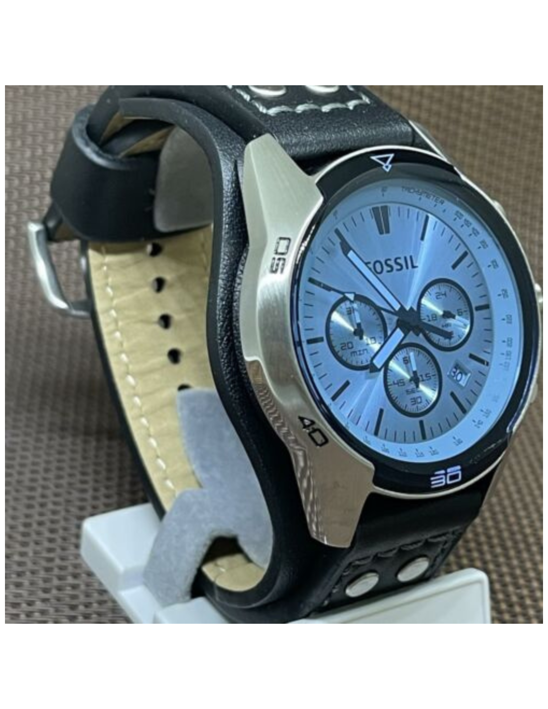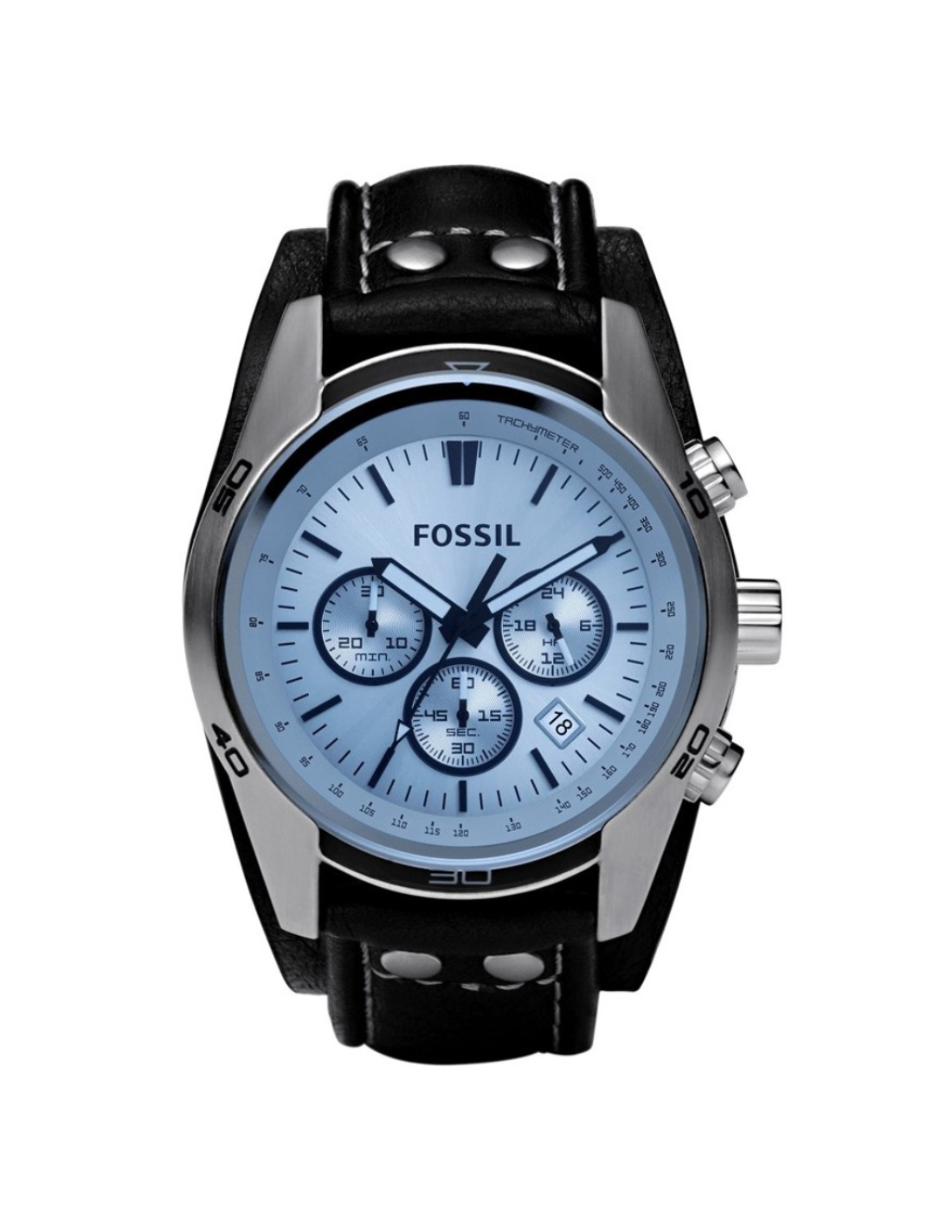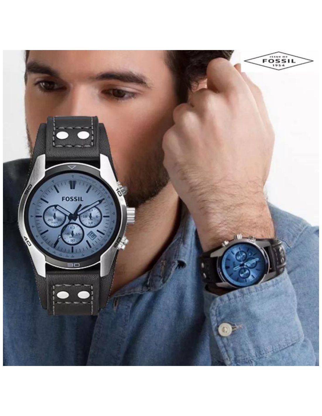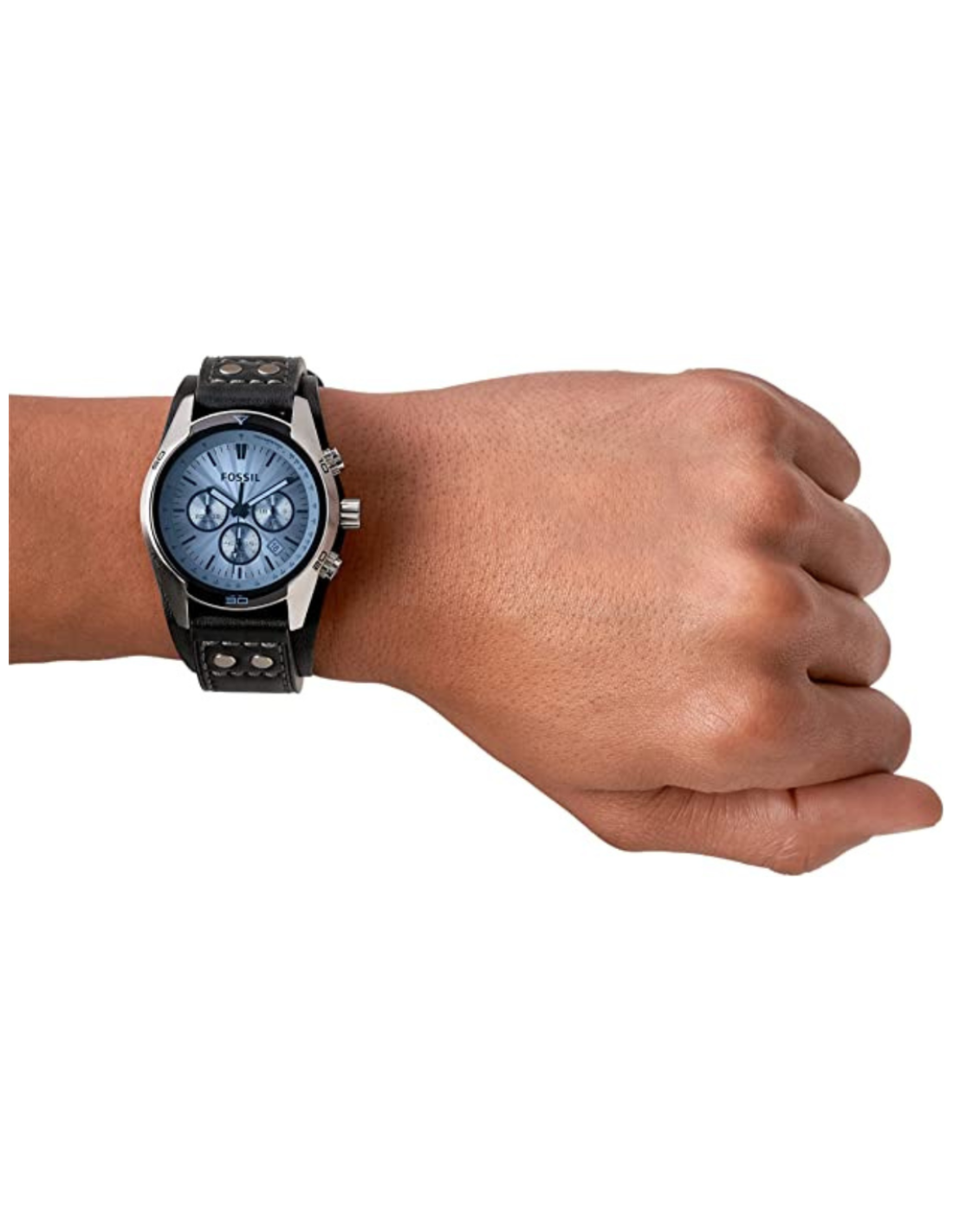 * Caja de acero inoxidable con esfera plateada y lente azul; puño de cuero negro genuino con cierre de hebilla ajustable; intercambiable con todas las correas de reloj Fossil de 0.866 in