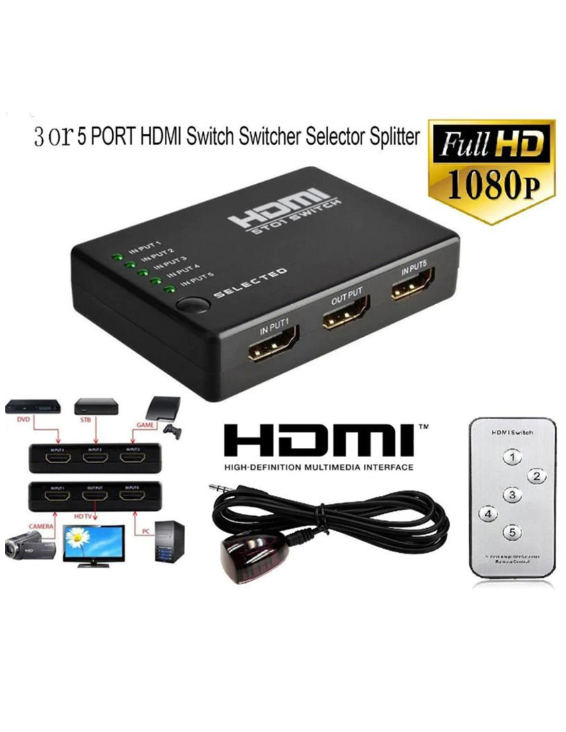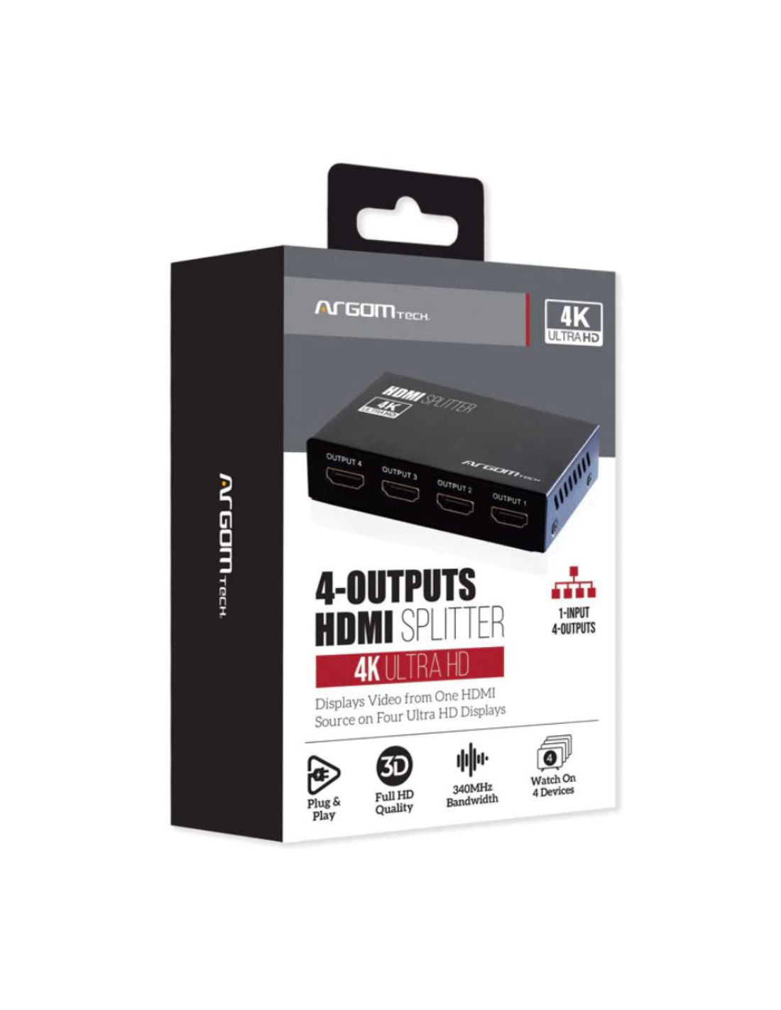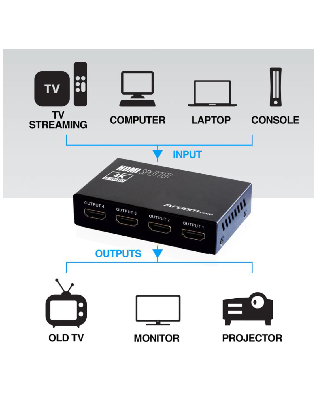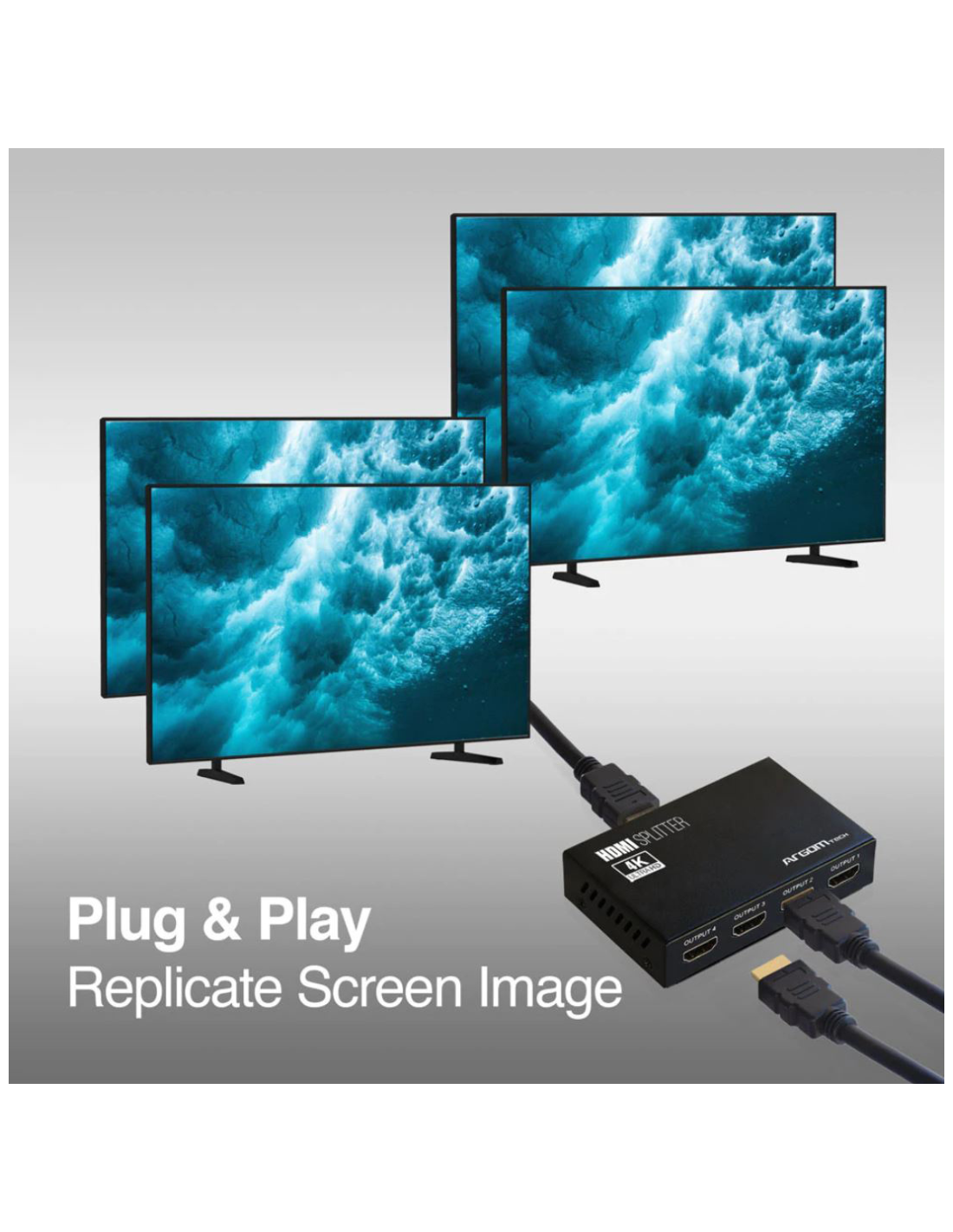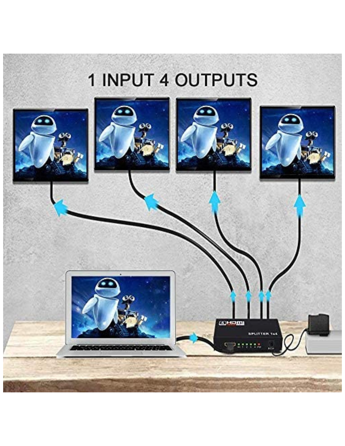 - El divisor HDMI de cuatro canales permite replicar un dispositivo (consolas de juegos, computadoras, dispositivos de transmisión y reproductores de A/V) en cuatro pantallas, como monitores, televisores o proyectores.