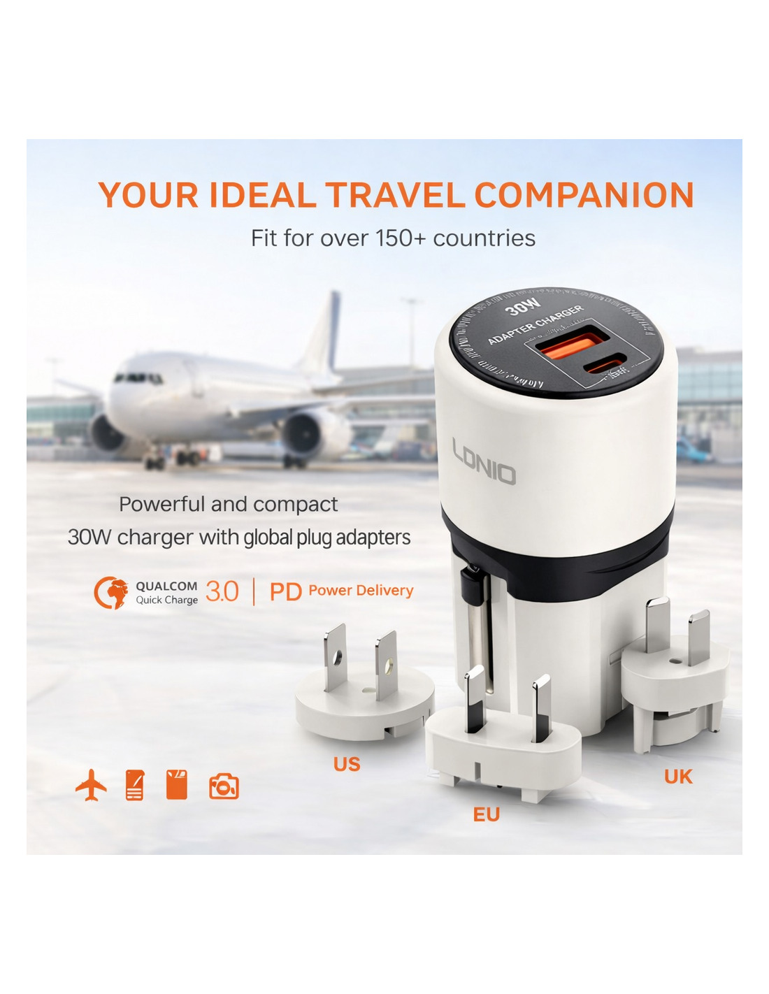 Además, incorpora clavijas intercambiables EU / US / UK / AU, convirtiéndolo en el compañero perfecto para viajes internacionales.