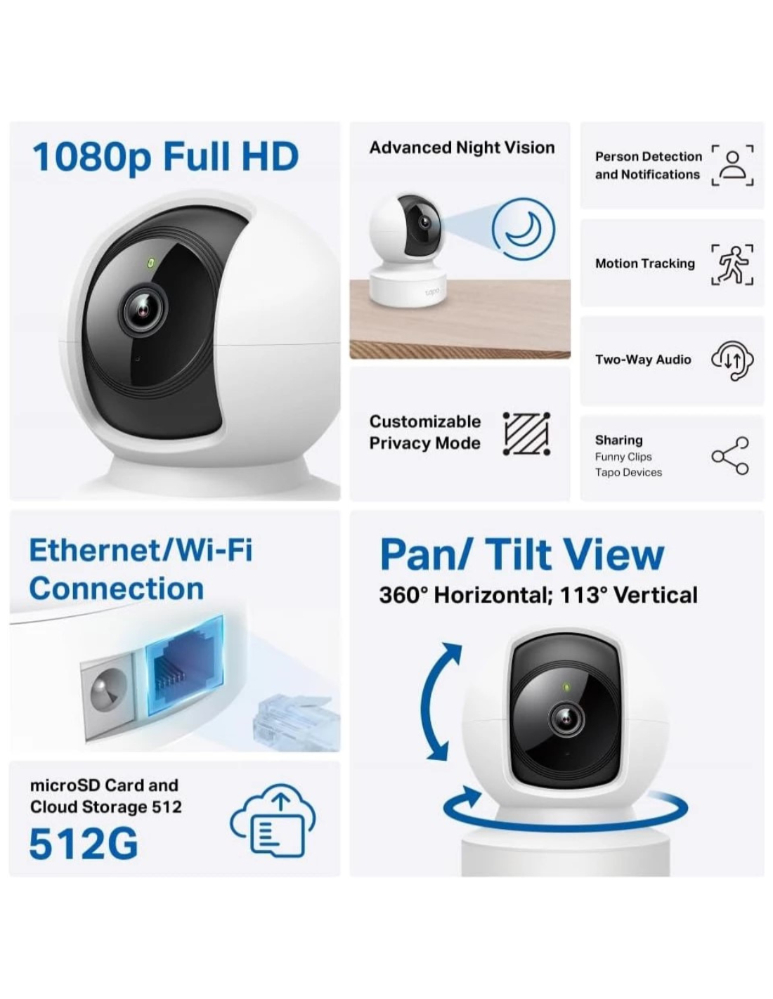 TPLINKLa Cámara TP-Link WiFi Tapo C202 es una cámara de seguridad inteligente ideal para monitoreo en interiores. Ofrece una combinación de características avanzadas como resolución HD, visión nocturna, y funciones de alarma, perfecta para hogares o pequeñas oficinas. Aquí tienes un resumen de sus especificaciones clave:
