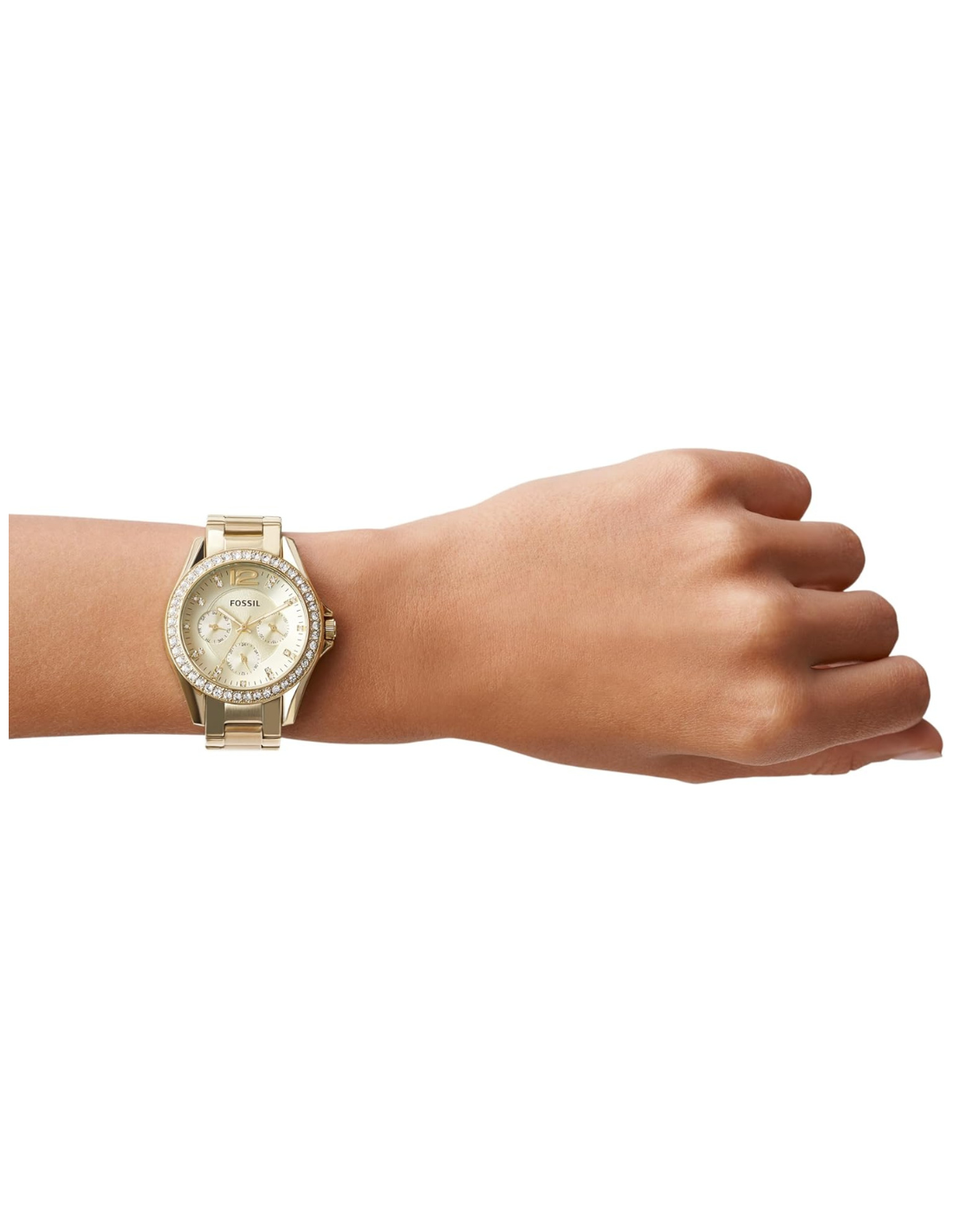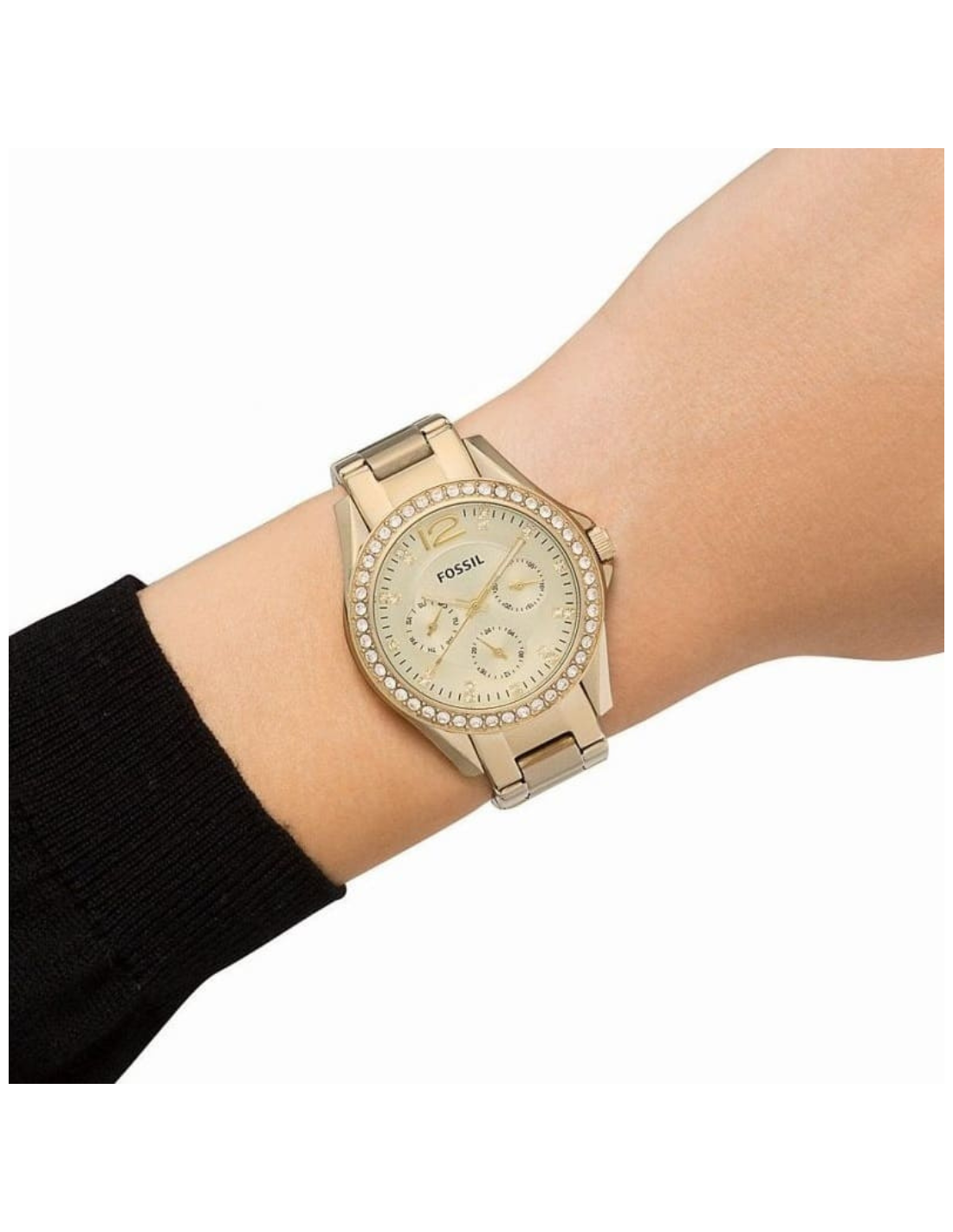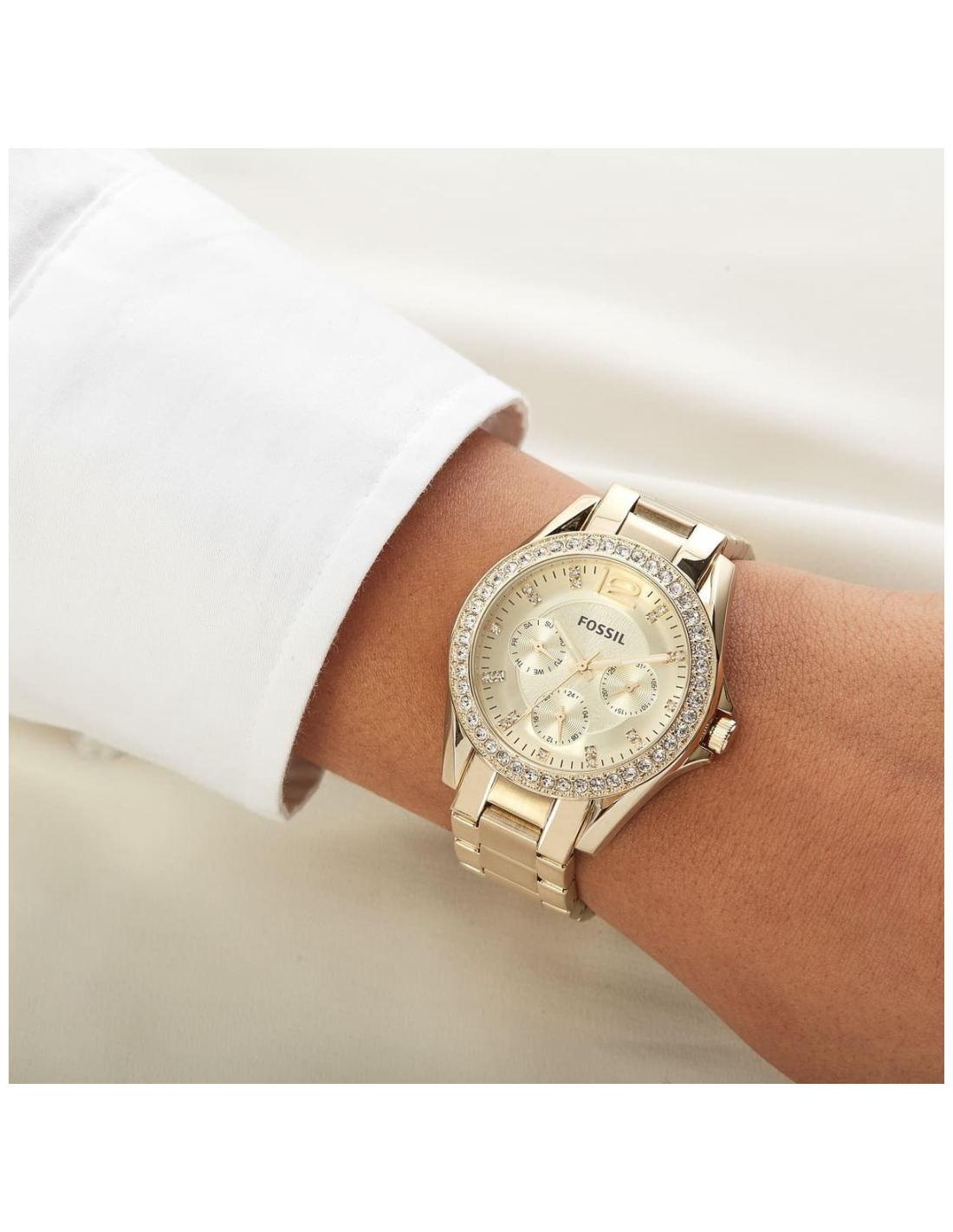 - Caja de acero inoxidable dorado con esfera dorada; correa de acero inoxidable dorada; los eslabones se pueden quitar para un ajuste personalizado