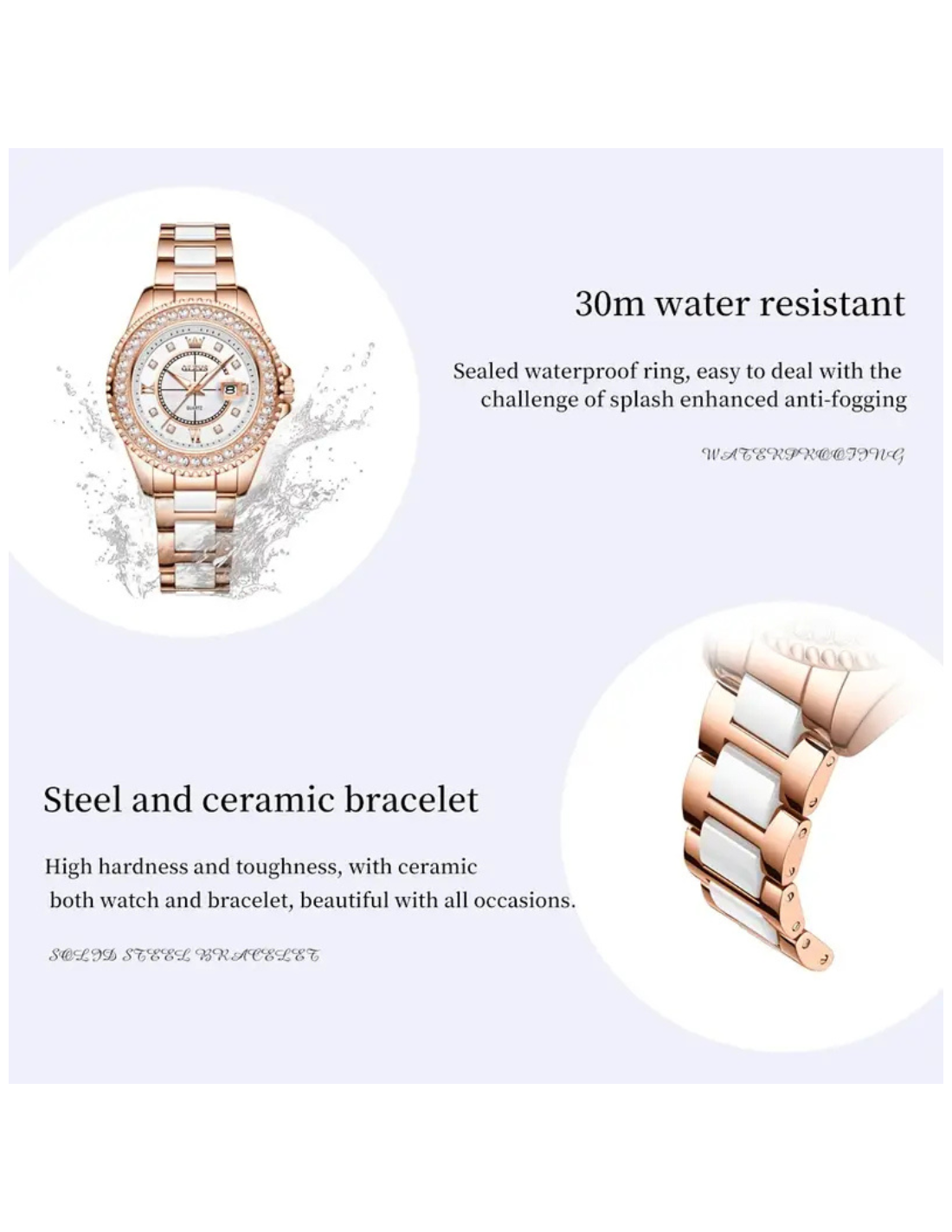 - Caja y correa: según algunas fuentes la correa es de acero inoxidable (o bien acero + cerámica en ciertos acabados) — por ejemplo, “Stainless Steel” como material listado.