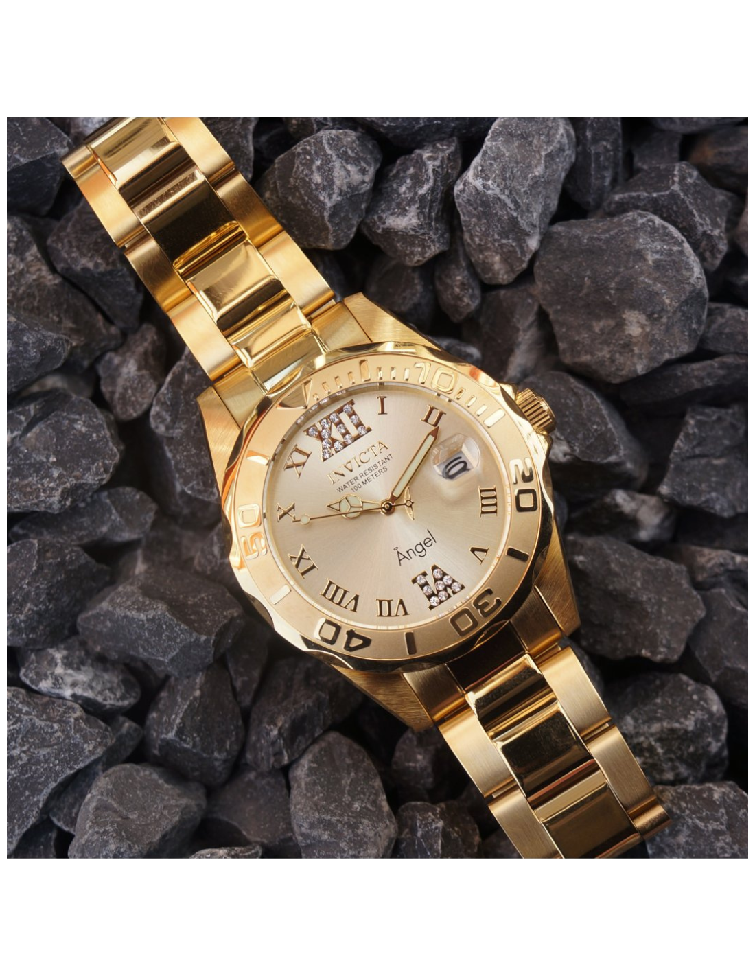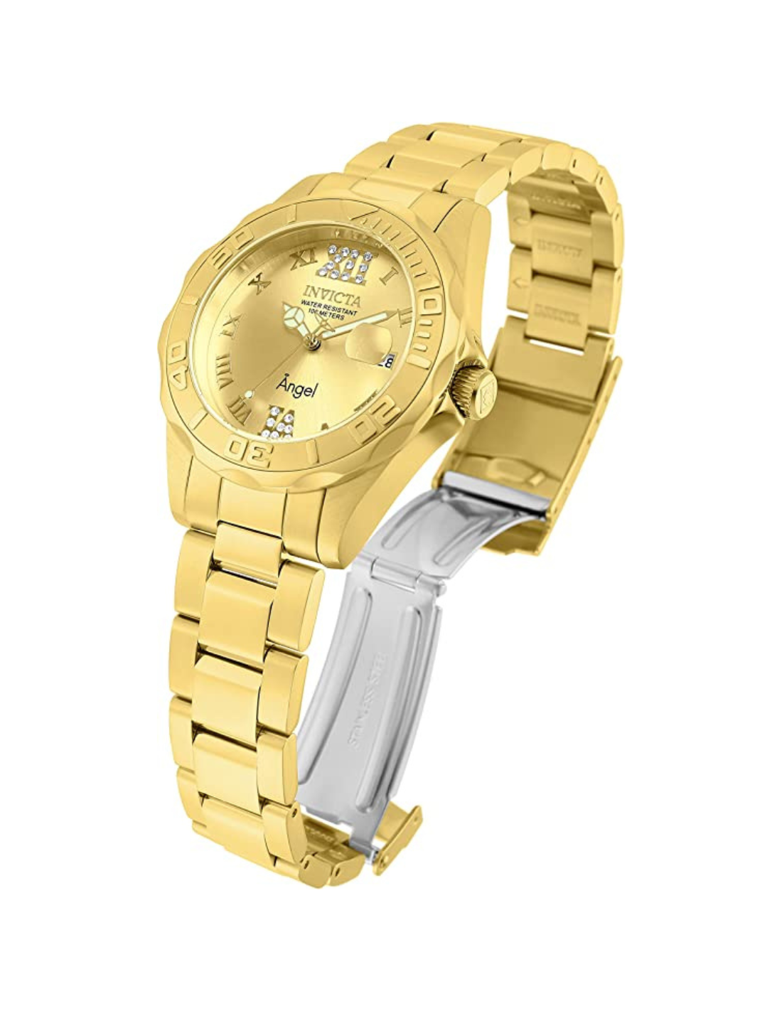 * Caja de acero inoxidable en tono dorado de 1.496 in de diámetro x 0.472 in de grosor; esfera dorada con 20 detalles de cristal; manecillas luminosas