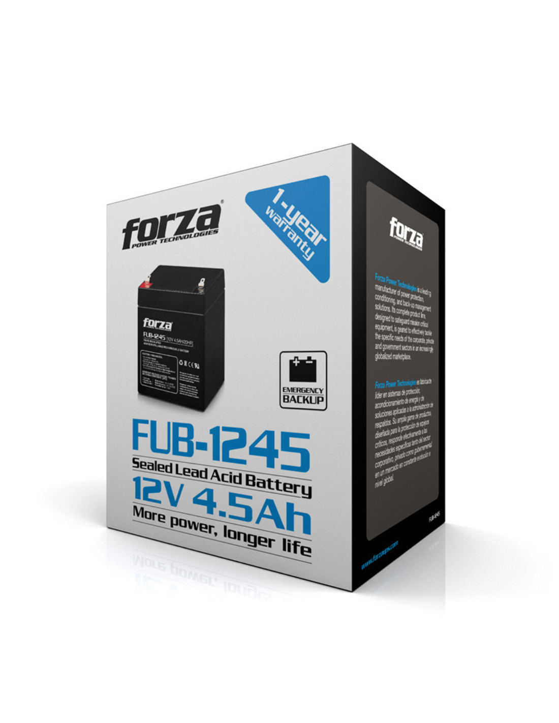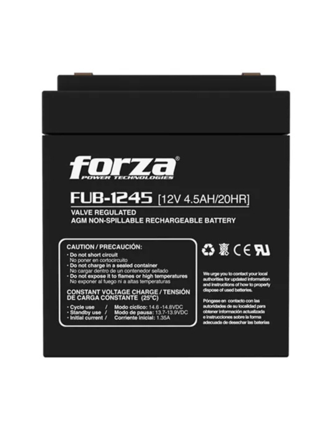 La batería Forza FUB-1245 / 12V 4.5Ah es una batería sellada de plomo-ácido regulada por válvula (VRLA), diseñada para proporcionar energía de respaldo confiable en sistemas de UPS, equipos de seguridad, sistemas de alarma, iluminación de emergencia y otros dispositivos de respaldo energético.