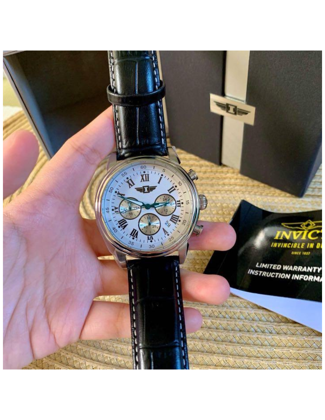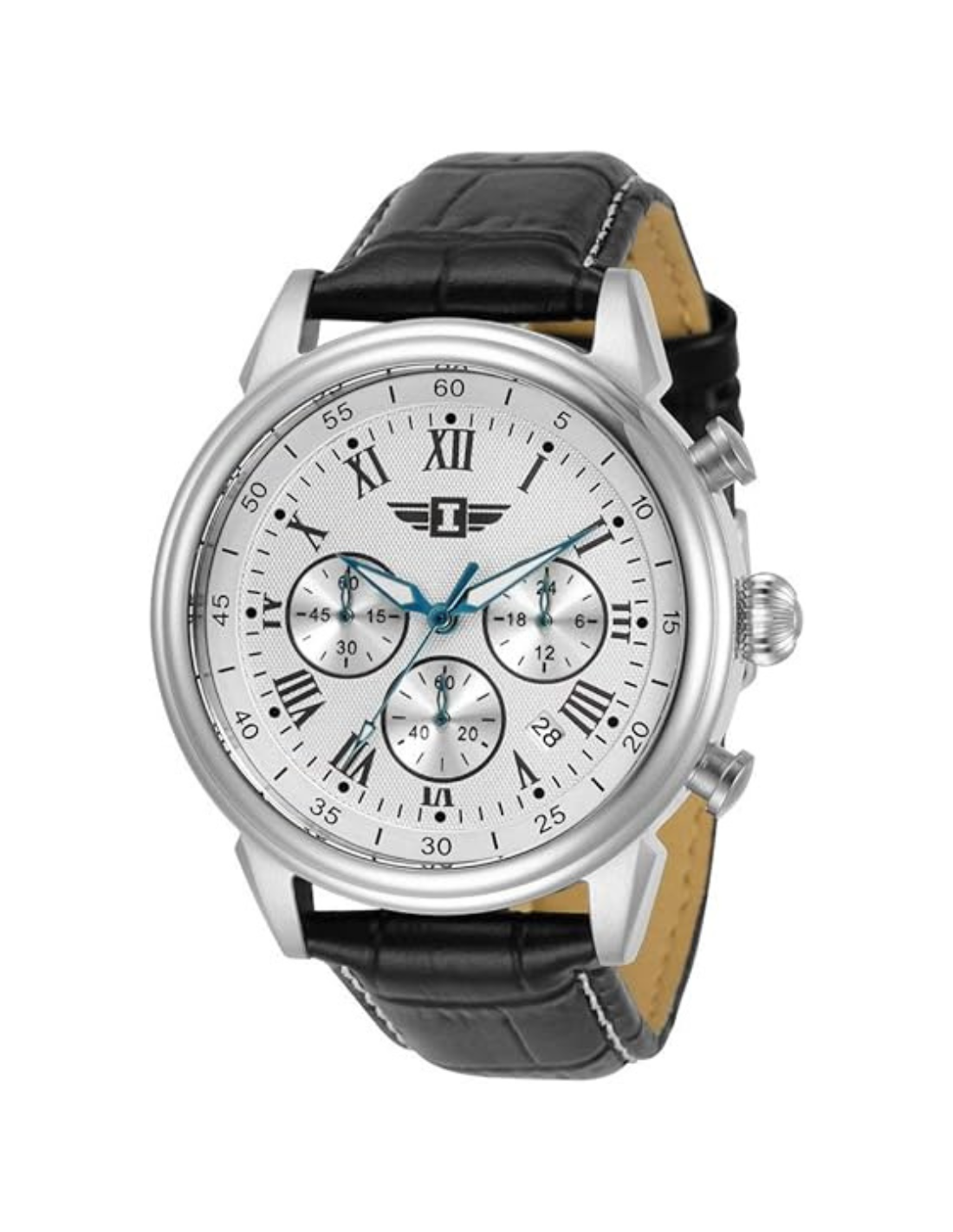 - Caja de acero inoxidable de 1.732 in de diámetro x 0.492 in de grosor; esfera blanca; manecillas luminosas