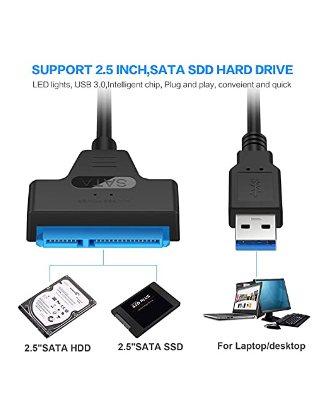 - 【Fácil de usar】: adaptador SATA a USB 3.0 intercambiable en caliente, plug & play, no necesita controladores. para una unidad de 2.5" sin necesidad de una fuente de alimentación adicional, una luz LED indica el estado de potencia y actividad. La longitud del cable es de solo 8 pulgadas, lo que es lo suficientemente bueno para clonar una unidad de disco duro de computadora portátil a una SSD